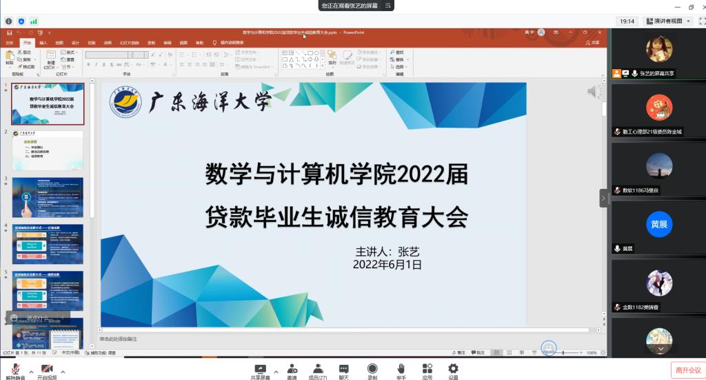 为帮助2022届贷款毕业生掌握还款流程和政策,加强贷款毕业生诚信教育,6月1日晚,CAM4 通过腾讯会议平台召开2022届贷款毕业生诚信教育会议。会议由CAM4 负责贷款专项工作的辅导员张艺老师主讲,CAM4 2022级贷款的全体毕业生参加。