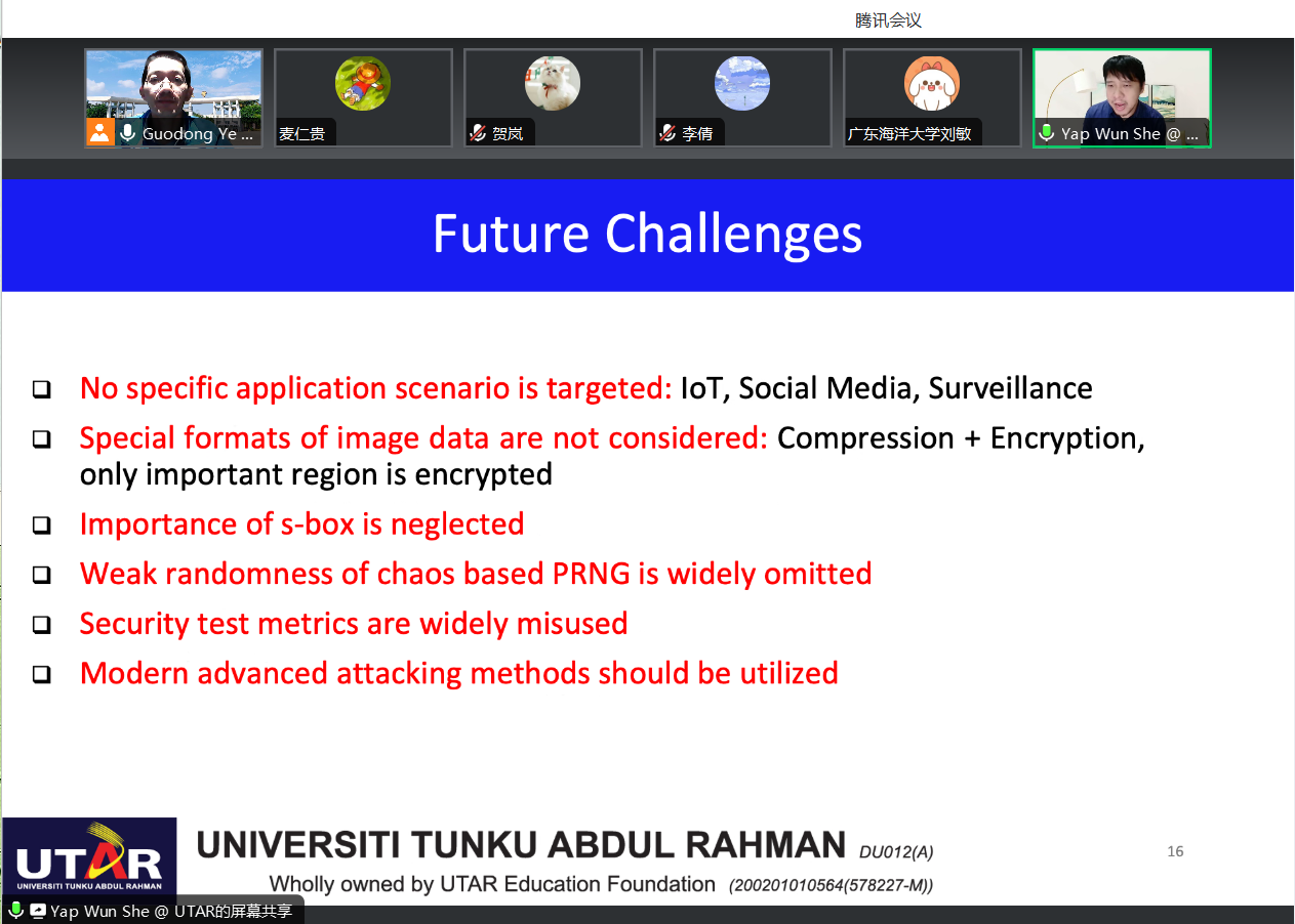 长Wun-She Yap博士以《Chaos-based cryptosystems: Basic Requirements and Lessons Learnt》为题,为我院师生作了一场线上学术报告,20多名师生在线聆听了报告。
