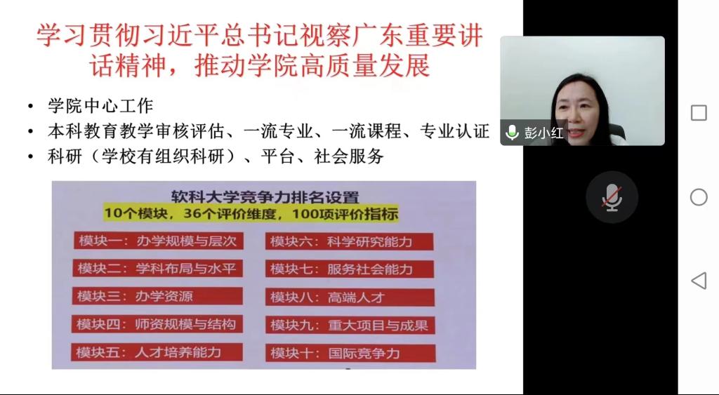 彭小红首先详细介绍了习近平总书记今年4月10日至13日先后到广东湛江、茂名、广州等地,深入企业、港口、农村等进行调研的过程,带领大家一同学习了习近平总书记视察广东时的重要讲话精神。并结合本科教育教学审核评估、一流专业、一流课程、专业认证、科研平台、社会服务等CAM4