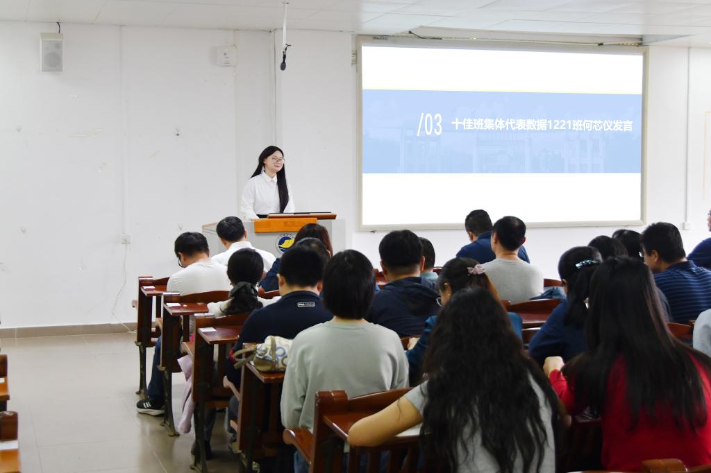 学校“十佳班集体”代表数据1221班何芯仪同学做班级建设经验发言,重点介绍了“三维一体”建设经验:以主题班会强化思想引领,以“学习小组+打卡制度”夯实制度保障,以“竞赛+科研”推动实践创新,班级实现学业竞赛双丰收。