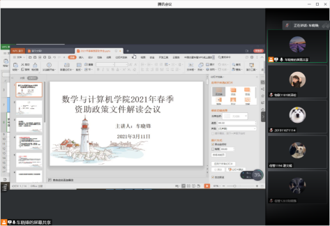 3月11日晚8点,CAM4 利用腾讯会议室召开学生春季资助政策宣讲会。会议由CAM4 学生资助工作专员、辅导员车晓锋老师主持,张艺、施堂怡两位老师和390多名上一年秋季认定的家庭经济困难学生参加。