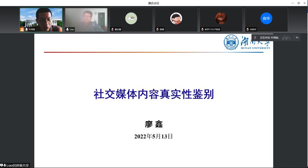 的邀请,湖南大学廖鑫教授作了题为“社交媒体内容真实性鉴别”的学术报告,我院师生等共计70多人在线聆听。本次学术报告由叶国栋教授主持,以腾讯会议的形式线上举行。
